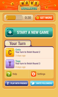 Word Challenge is a fun, quick and social word-searching game in which players challenge their friends and other players to see who can find more words on a 4 by 4 board of random letters in two minutes. The game supports English, Spanish and Portuguese boards.